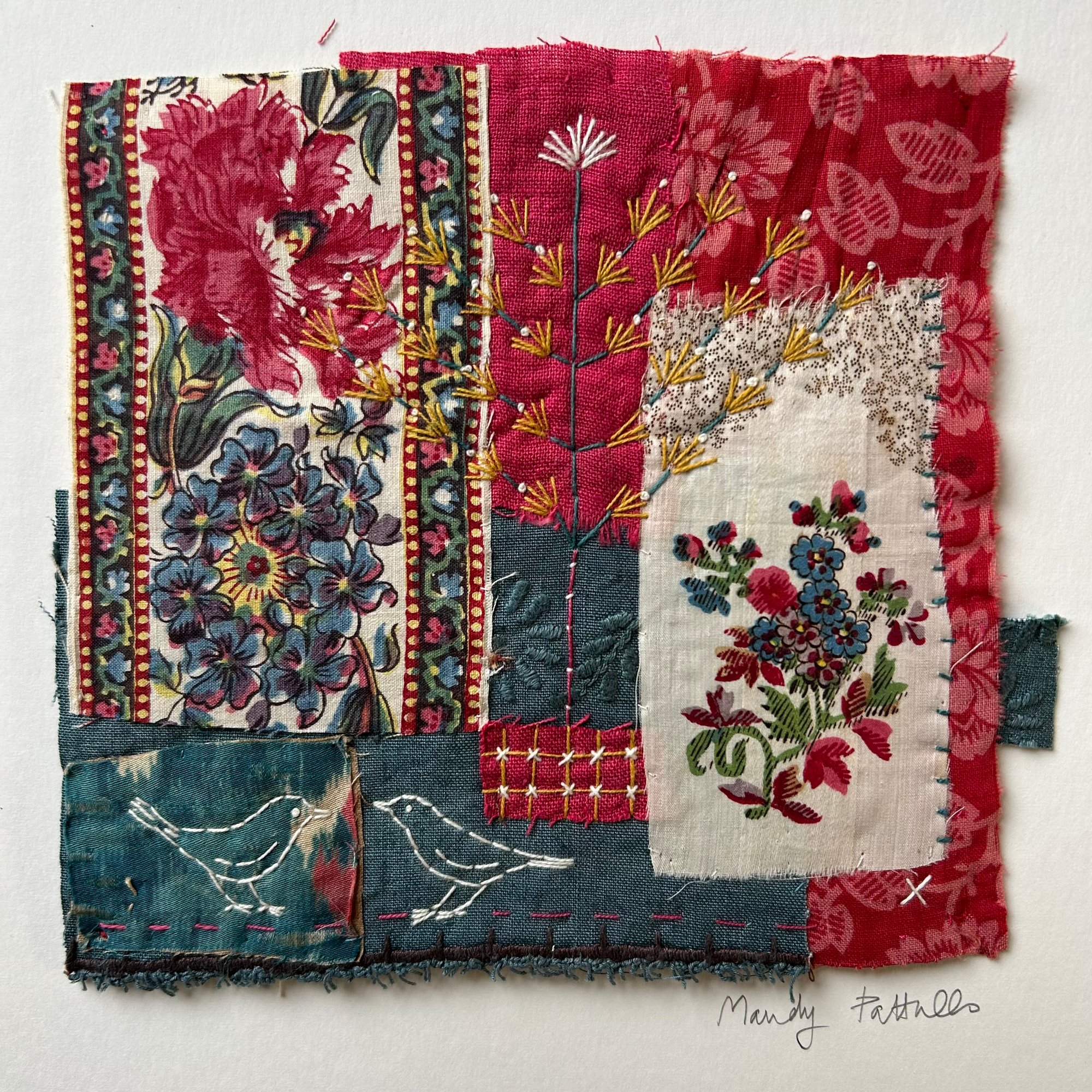 Unframed textile collage assembled using very old pieces of French fabric..Everything is hand stitched. This is a unique piece. The textile measures 16 x 17cm and the mount board on to which it is mounted measures 27 x 29cm. Get it framed or just unwrap and prop some where. UK only tracked postage